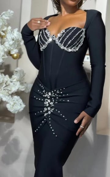 This Gem-Ribboned Maxi Dress is a stunning black party dress with structured beading across the bodice, ruching at the hips, and a jeweled floral centerpiece—perfect as an elegant dinner party dress with noble charm.