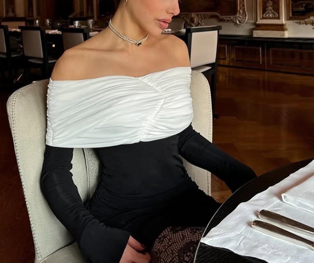 This off-shoulder mini dress is a chic colorblock wedding dress in striking black and white. Featuring a one-shoulder design and pleated details on the neckline and hem, this elegant wedding dress is perfect for a bold bridal statement.