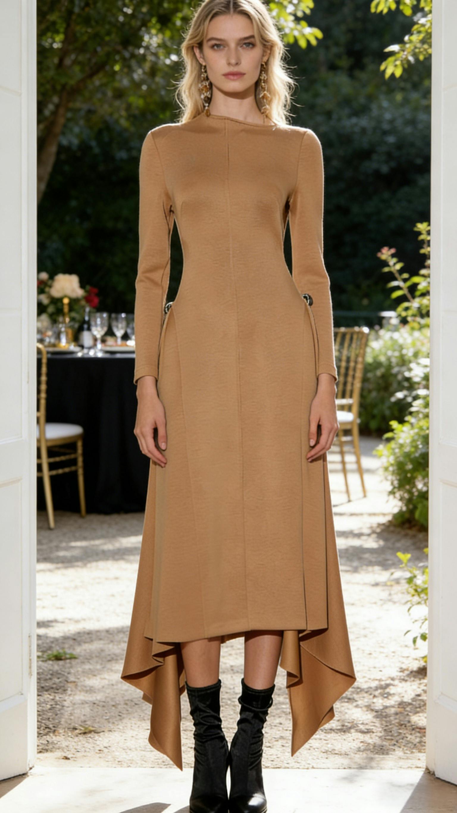 This brown evening dress features an asymmetric slanted neckline and a ruched, folded skirt design. Its solid color and modern silhouette exude elegance and fashion, making it a perfect choice for formal dinners and evening events.