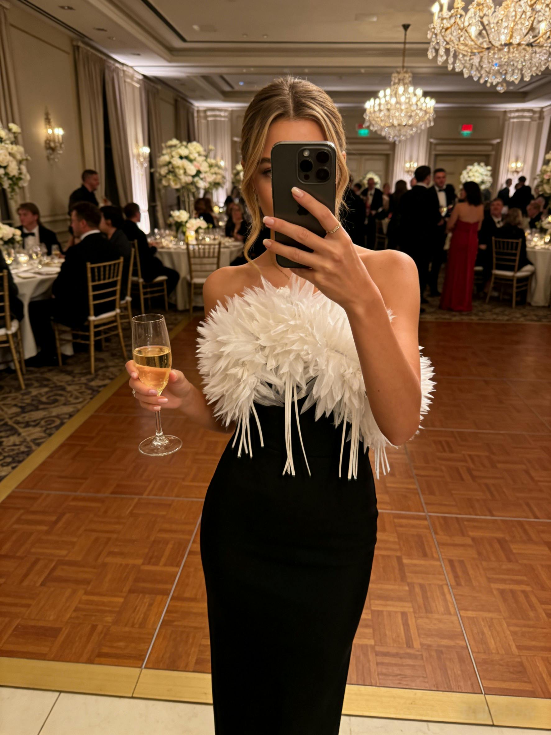 Elevate your wedding look with this black formal midi dress, featuring a strapless silhouette and feather trim detailing. Designed as a feather trim wedding dress or elegant strapless midi dress, it’s perfect for receptions, cocktail parties, and evening celebrations.