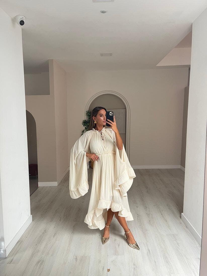 This deep V-design midi dress is a stunning cloak-sweep vocation dress in white, featuring elegant ruffled edges on both the skirt and cape. Flowing and ethereal, it’s a perfect vocation dress for a graceful vacation look.