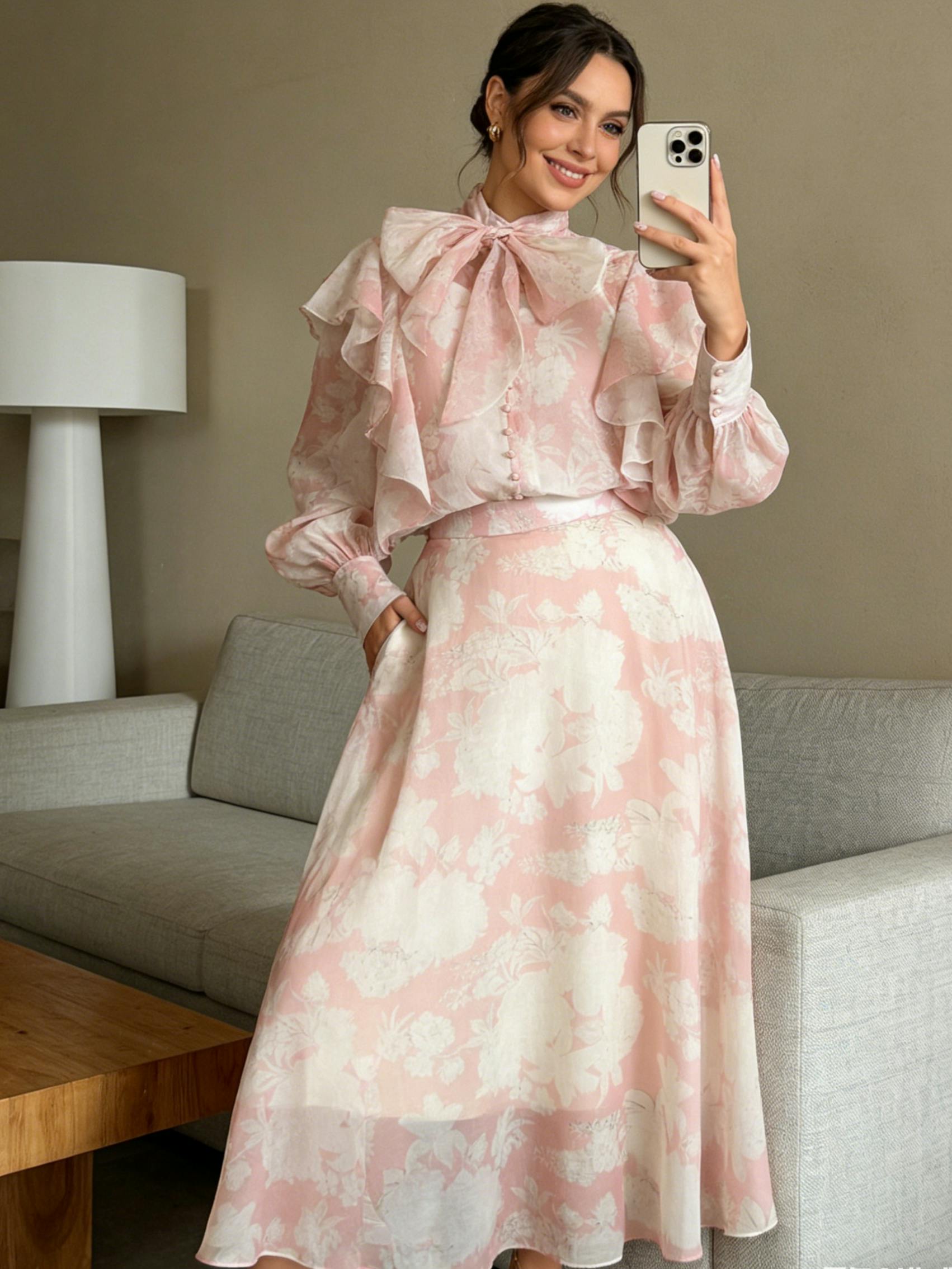 This floral print midi dress with mesh detail and a tie neck is perfect for vacations. A chic mesh vacation dress and elegant floral gown that blends feminine charm with breezy elegance.