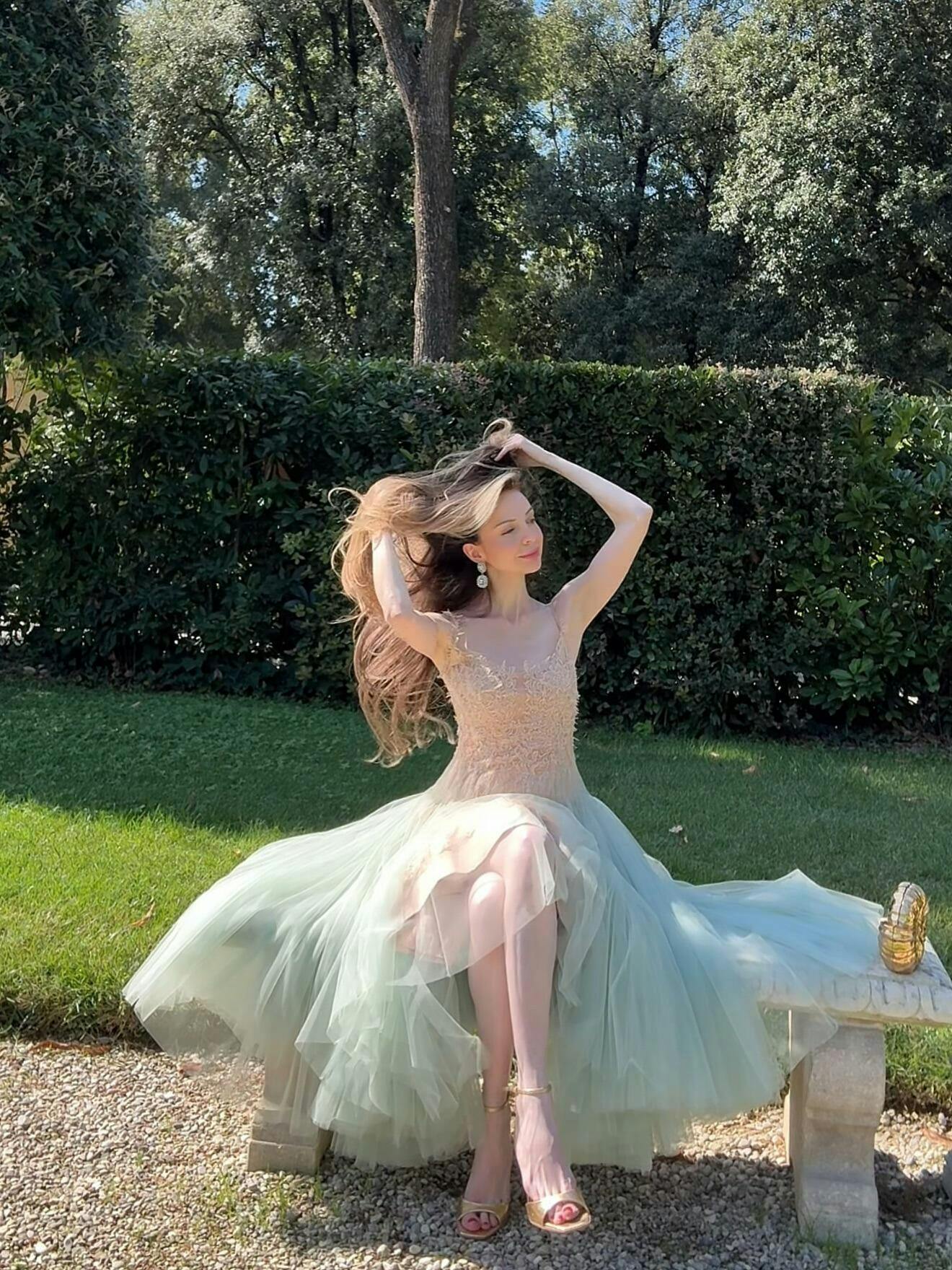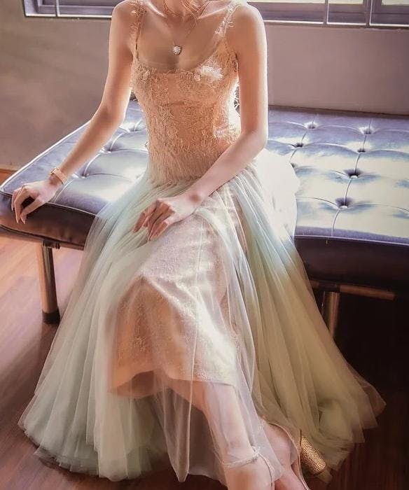 This mint green dress is a dreamy vocation maxi dress with lace details and a gradient mesh design. Featuring a graceful backless cut, this slim-fitting vocation dress is perfect for dancing or artistic vacation moments.