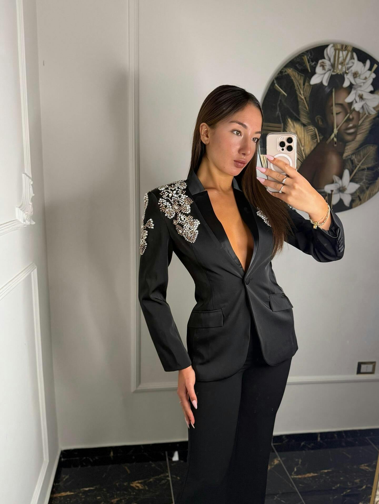 Zweiteiliges Set aus Blazer mit V-Ausschnitt und Schlitzhose mit Strass