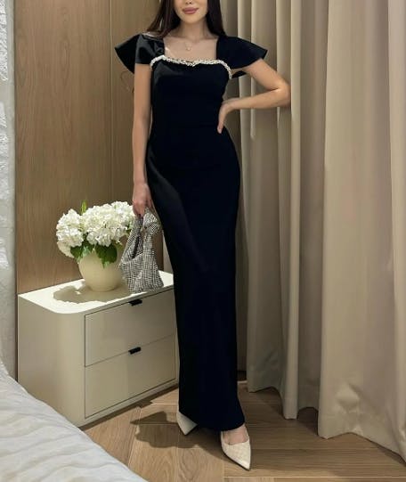Cette robe de soirée noire présente un décolleté carré flatteur, un appliqué floral argenté en 3D sur la poitrine et une coupe moulante élégante. Une superbe robe de soirée ornée de cristaux et une robe longue moulante de gala sont parfaites pour une tenue de soirée élégante.