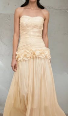 Cette robe de mariée blanche est une robe longue bustier amincissante, ornée d'élégants plis et d'un motif floral tridimensionnel sur la jupe, avec un ourlet tombant gracieux. Romantique et raffinée, c'est la robe de mariée idéale pour un look intemporel.
