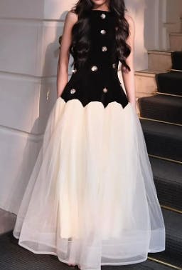 Une robe midi sans manches saisissante, avec un haut noir élégant et une jupe en tulle blanc vaporeux : une alternative à la robe de mariée taille empire qui sublimera votre silhouette. Parfaite pour les invitées qui souhaitent se démarquer lors de leur mariage.