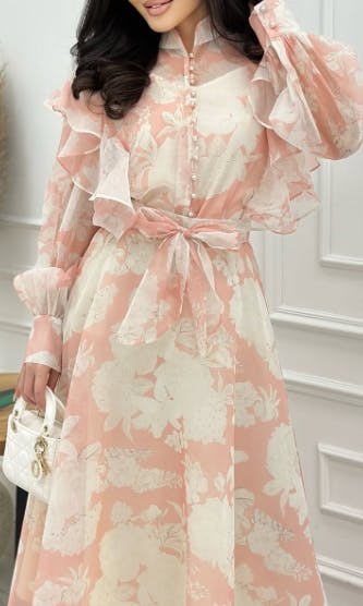 This floral print midi dress with mesh detail and a tie neck is perfect for vacations. A chic mesh vacation dress and elegant floral summer gown that blends feminine charm with breezy elegance.