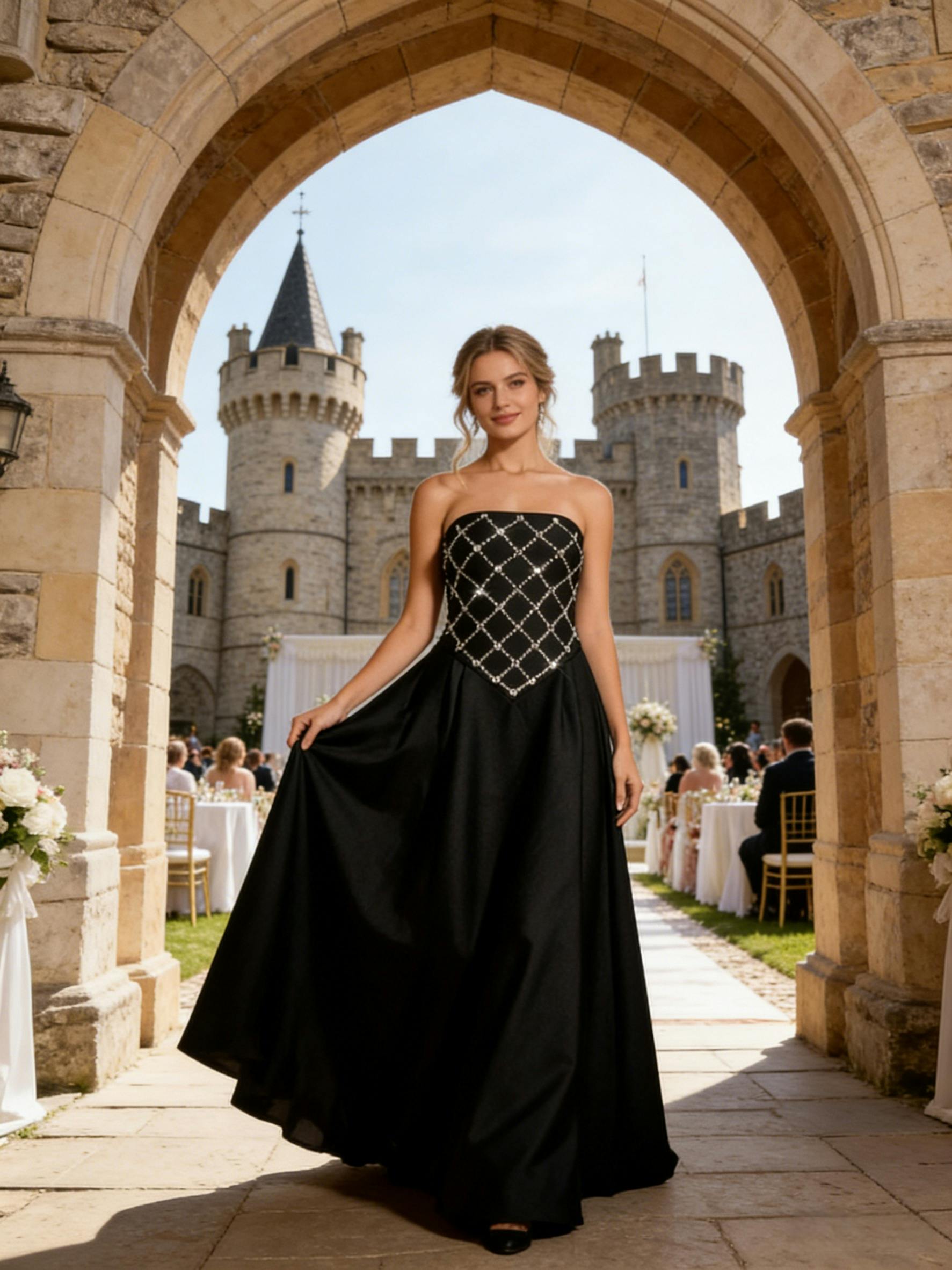 Make a statement in this black formal midi dress, adorned with a sparkling rhinestone grid pattern. Designed as an elegant wedding midi dress or rhinestone grid midi dress, it’s perfect for weddings, formal parties, and festive gatherings, blending modern style with timeless elegance.