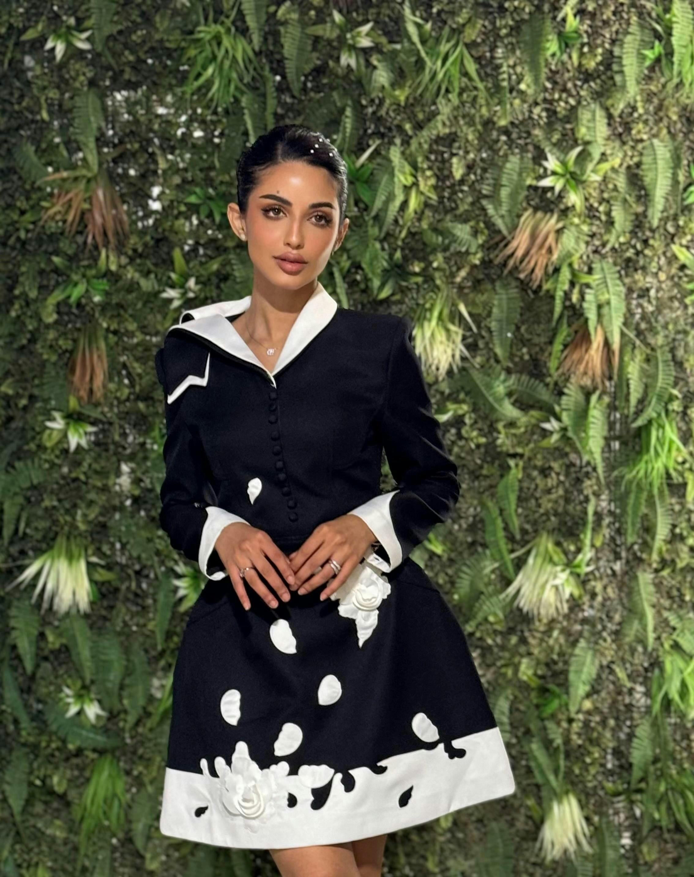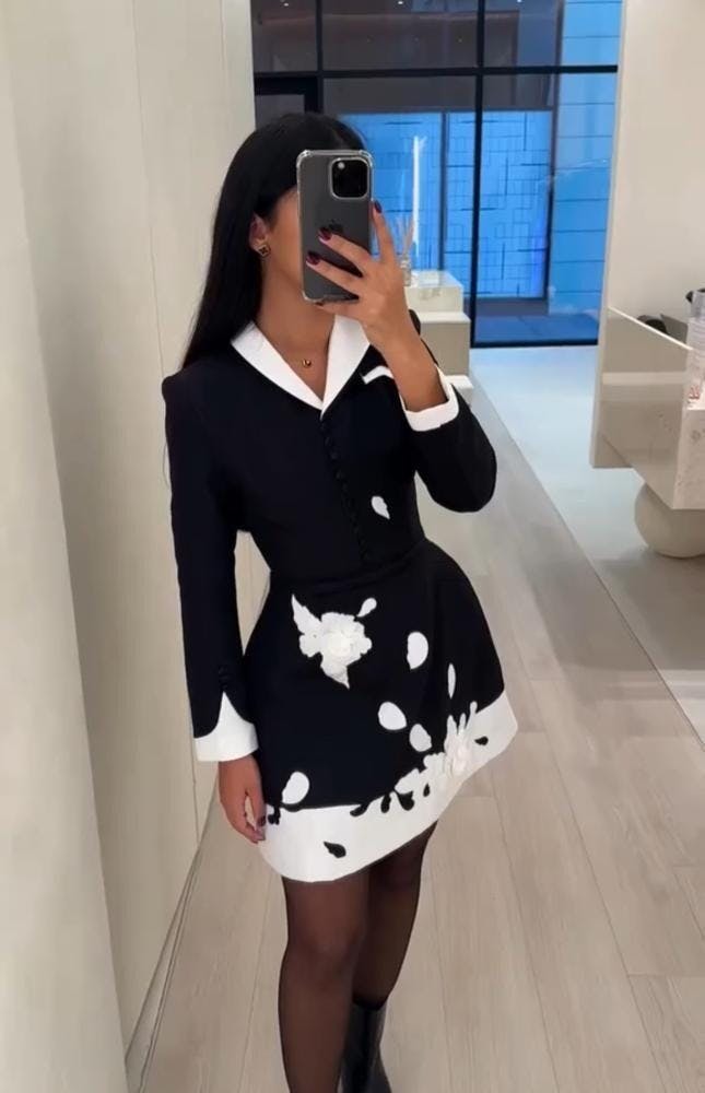 Élégante et audacieuse, cette robe midi monochrome à appliqués présente un contraste saisissant de noir et blanc et des appliqués floraux. Une robe de soirée raffinée ou une robe de mariée noire affirmée pour celles qui apprécient la sophistication unique.
