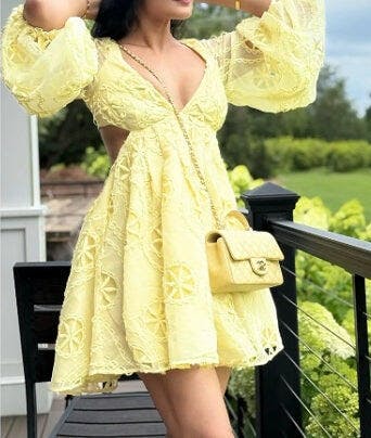 Cette robe jaune est une mini-robe audacieuse, conçue pour celles qui aiment se démarquer. Avec son décolleté en V profond, ses manches bouffantes et son dos nu évasé, c'est une robe sexy et élégante, idéale pour les escapades ensoleillées.