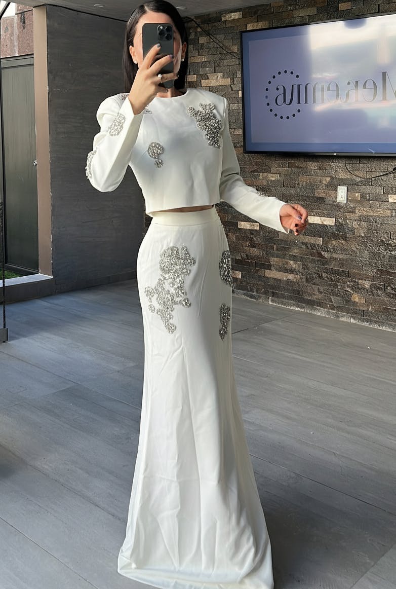 Cet élégant ensemble de mariage blanc se compose d'un haut court orné de perles et de pavés, orné de perles florales sur les manches et la jupe. Sa taille haute flatte la silhouette et en fait un ensemble raffiné idéal pour une soirée festive.