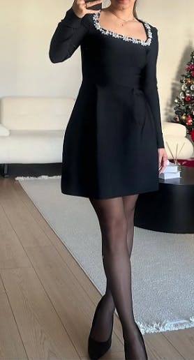 Perfect for any wedding celebration, this Square-Neck Mini Dress features delicate 3D floral accents around the neckline, long sleeves, and a high waist silhouette for an elegant, flattering wedding dress look.